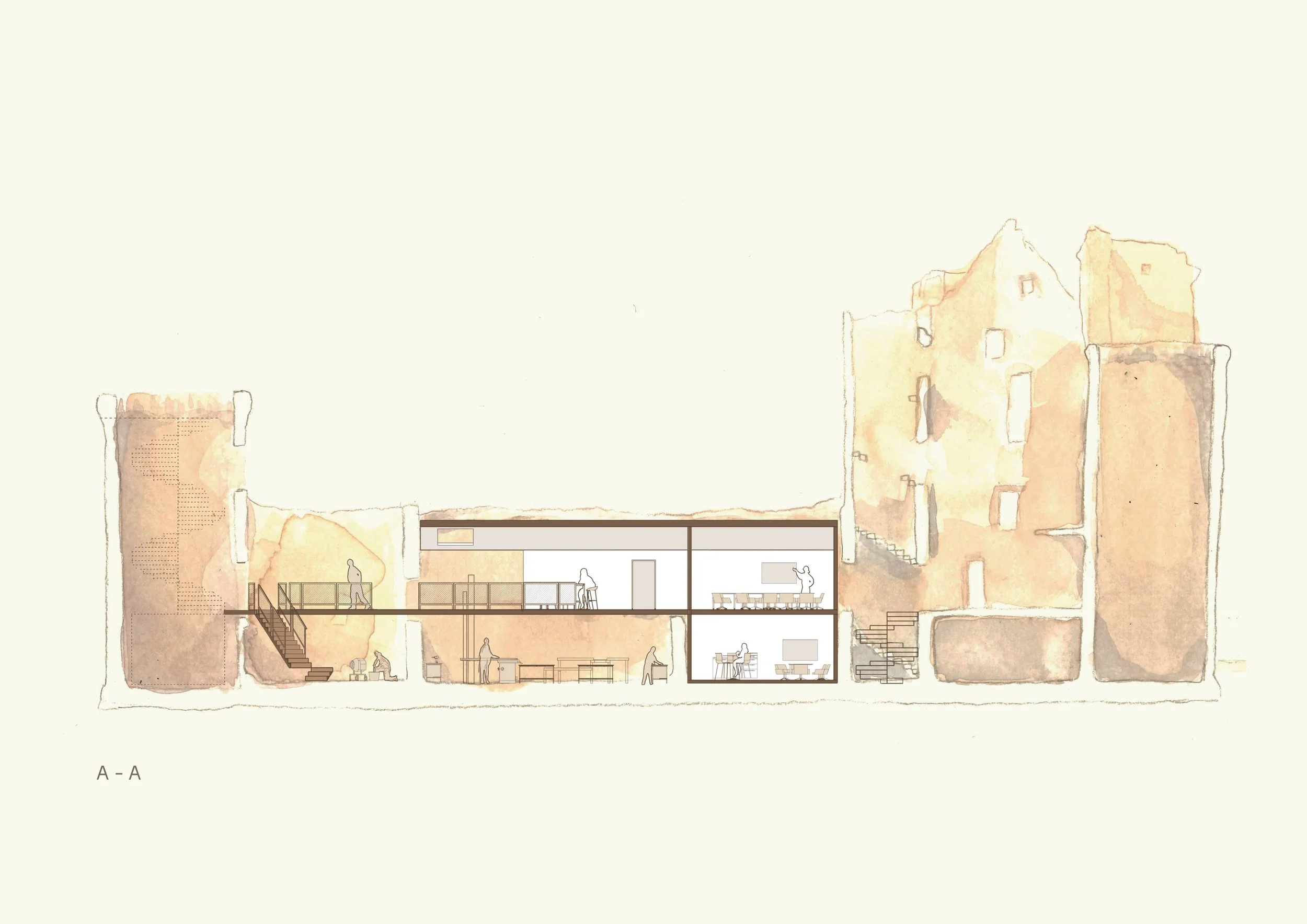 This included development in adjacency diagrams, creating a unique material palette only from on-site materials, exploring the archetypes of retrofit, and integrating the programme itself into the design.