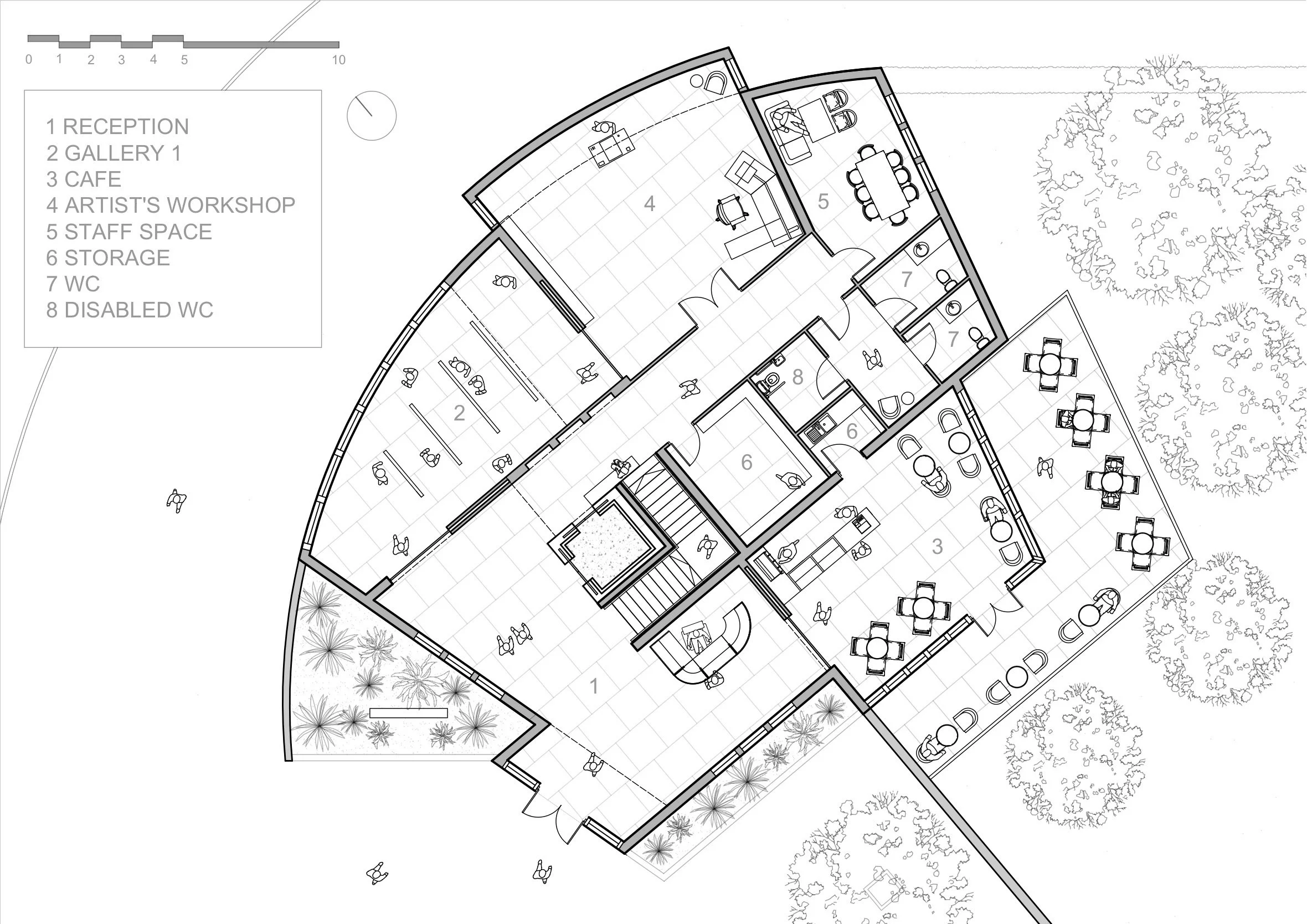 “The aim of the project was to design an art gallery that responds to the surrounding context of Park Circus in Glasgow. The proposal was themed around the work of Minty Sainsbury who creates highly realistic architectural drawings. Through this, the gallery allows visitors to view the inspiration for the artwork through a curved glass wall that responds to the existing shape of the site. The gallery’s orientation was also considered; the main exhibition spaces are located to the North to benefit from consistent natural light, whilst public areas such as the cafe and community space are positioned to the south, offering views across the gardens.”