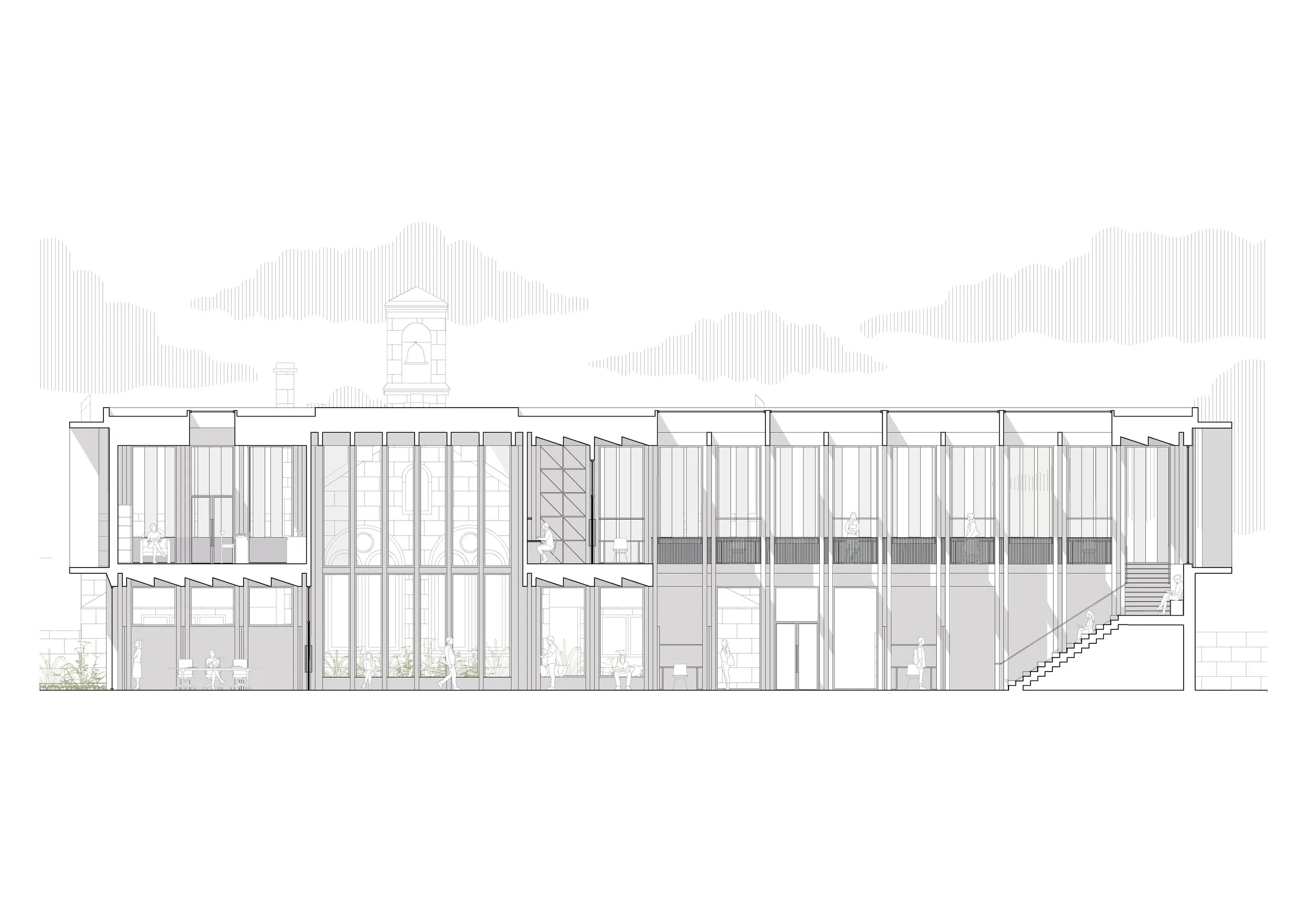 Three stages of construction extend the composition of the ruins through time and space. Strategically placed walkways define spaces and complete the desired path around the castle at first-floor level. Circulation is dynamic and rounded, shaped by views and position in the landscape. The castle becomes a Construction Hub, upskilling learners in stone construction through their building of a multi-purpose extension hall. Local sandstone is celebrated. The centre expands with habitation and use, yet remains sensitive to the historic site.”