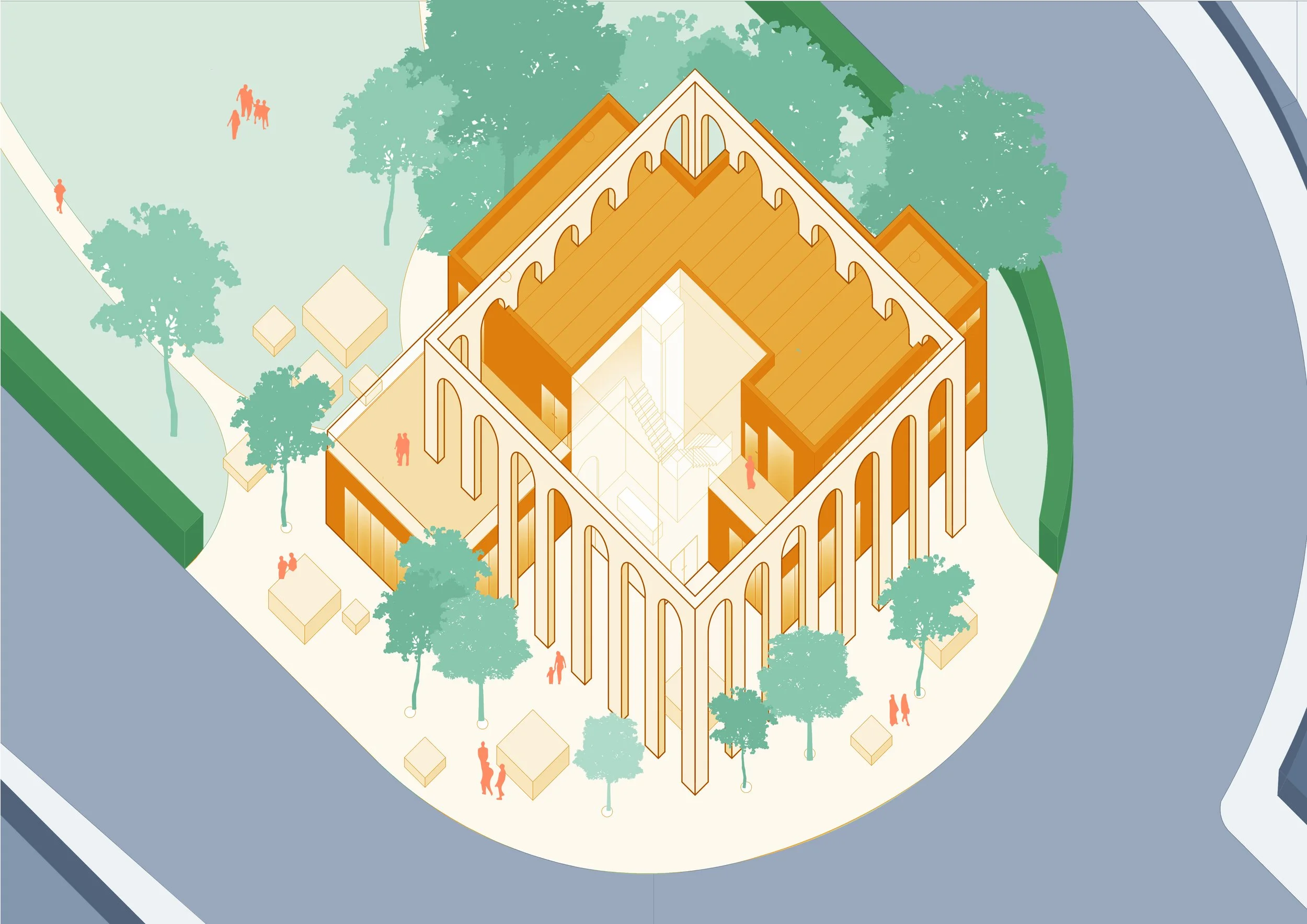 “Inspired by the architecture of Park Circus, Gallery Arcadia’s central feature is the sandstone arches encompassing and perforating the building. They create an initial entrance through a secondary outdoor space - distinctly part of the gallery, adjoining the surrounding public plaza. This addresses the issue of public vs. private space in a residential neighbourhood - by taking ownership of a quarter of the park, the original gardens can remain tranquil and secluded despite their communal nature. The arches also serve to connect the spaces within the building, tailored to allow visitors to interact with the structure whilst viewing the artwork.”