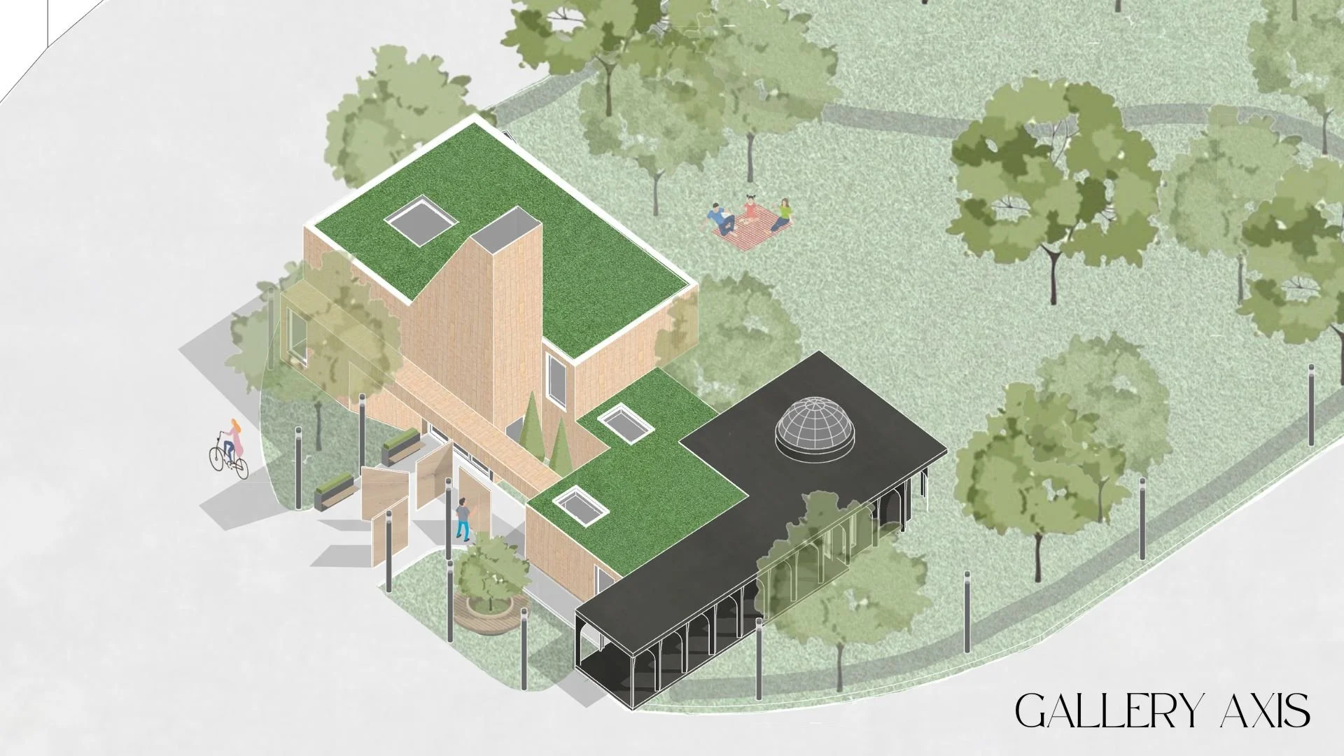 “Like a fortress atop a hill, Gallery Axis shapes its surroundings through its bold design and thoughtful placement. It serves as both a cultural landmark and source of inspiration for the community and visitors. The central tower rises proudly above the landscape, designed not only to capture the eyes of passersby, but also to create a connection between nature and urban environment. Positioned between the Park Circus Tower and the Lord Roberts Memorial in Kelvingrove Park, it is a symbolic bridge between these two worlds.”